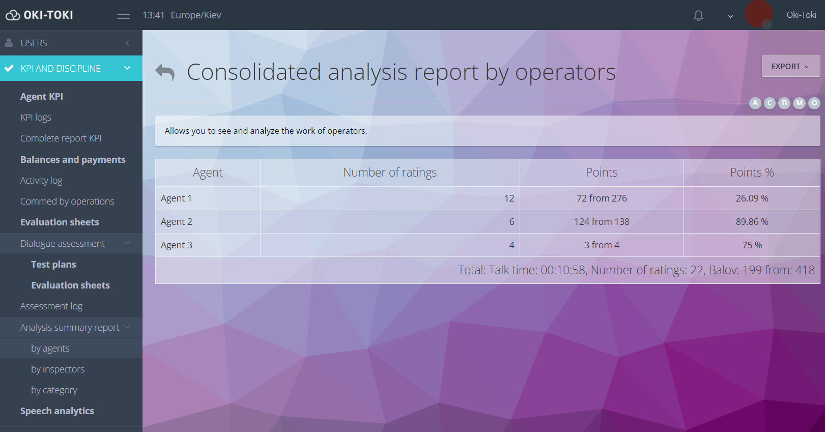 Reports on conversation evaluation in Oki-Toki will show both detailed data and summary statistics. Based on these reports, training strategies are developed and decisions are made to improve call center process workflows.
