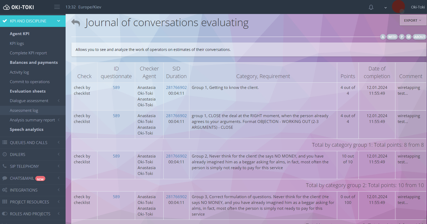 All results and comments are registered in the Evaluation Log. This report will help not only to view but also to thoroughly analyze the interaction of agents with clients based on their conversation evaluations and comments from checkers.