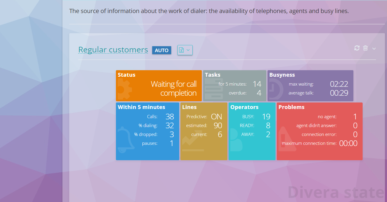 Power dial – mode for more intensive calling. Its feature is the ability to specify the number of lines per operator. In contrast to the Progressive mode, the dialing of lines will be carried out immediately after the end of the previous conversation of the operator (already on the PCP status). If there are errors “Reset. There is no free operator ” it is worth reducing the number of lines per operator. You can track up-to-date information on the number and proportion of dropped calls in the “Info” tab in the widget Status of Dilers . This mode can also be used for groups of up to 5 people.