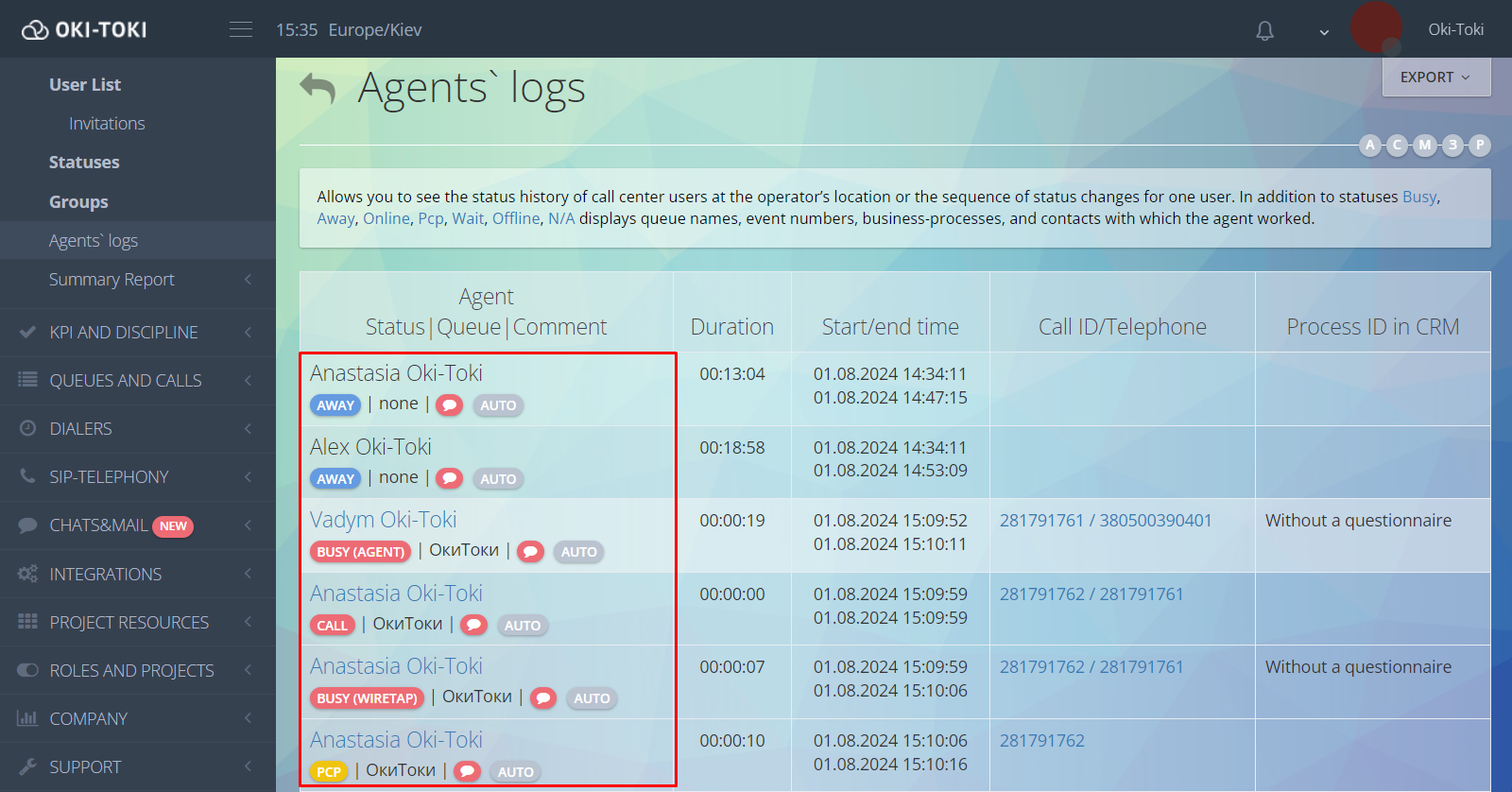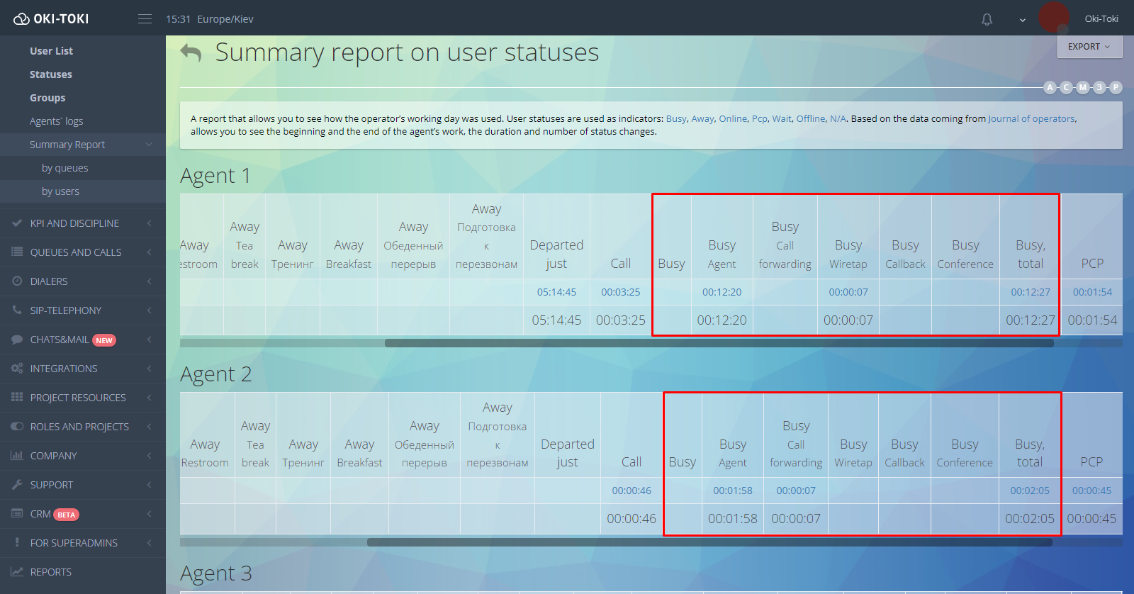 For the summary report by user statuses, we arranged the agent’s occupancy statuses in separate columns – this will make details’ analysis more convenient. This display is enabled with the active “With details” filter