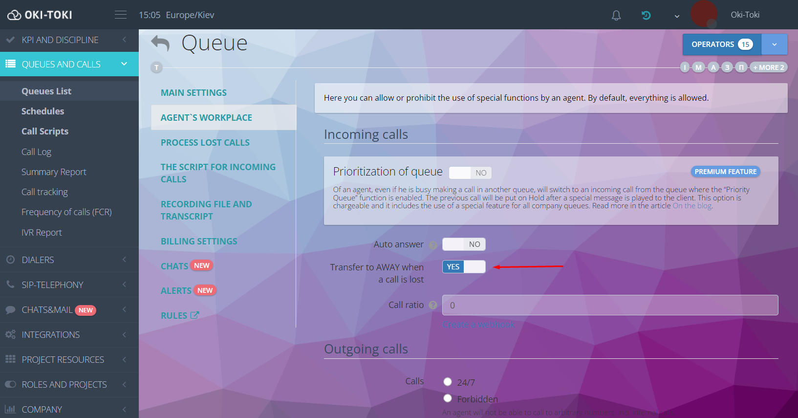 111There are still agents who do not track their statuses in the workstation (Ready, Absent). While working in their CRM and administrative cabinets, agents may miss an incoming call, violate discipline, and automatically switch to the “blue” status, dropping out of the processing of incoming and automatic calls. We have added the ability to disable automatic transition to AWAY when a call is missed for incoming and callback calls. By default, it is enabled. You can disable it here.