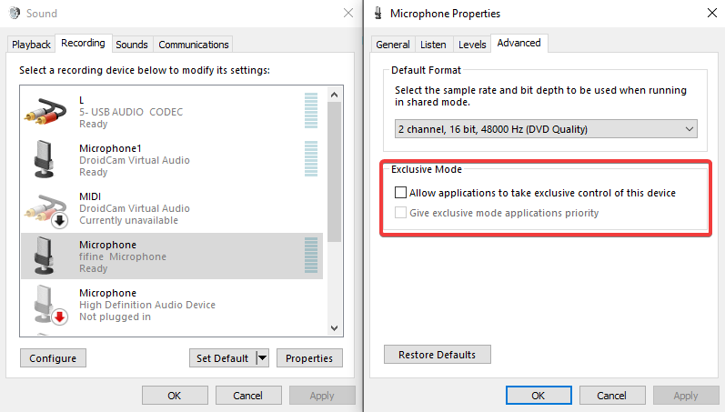 4. In the Properties window, go to the Advanced tab, in the Monopoly Mode section, uncheck Monopoly Mode Use.