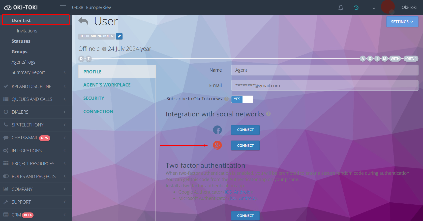 User account linking with Oki-Toki to a Google account, enabling future authorizations by simply clicking on the Google icon, instead of our authorization data. The linking process occurs in user settings and can be done in two clicks with a corresponding icon for logging in available on the authorization menu.