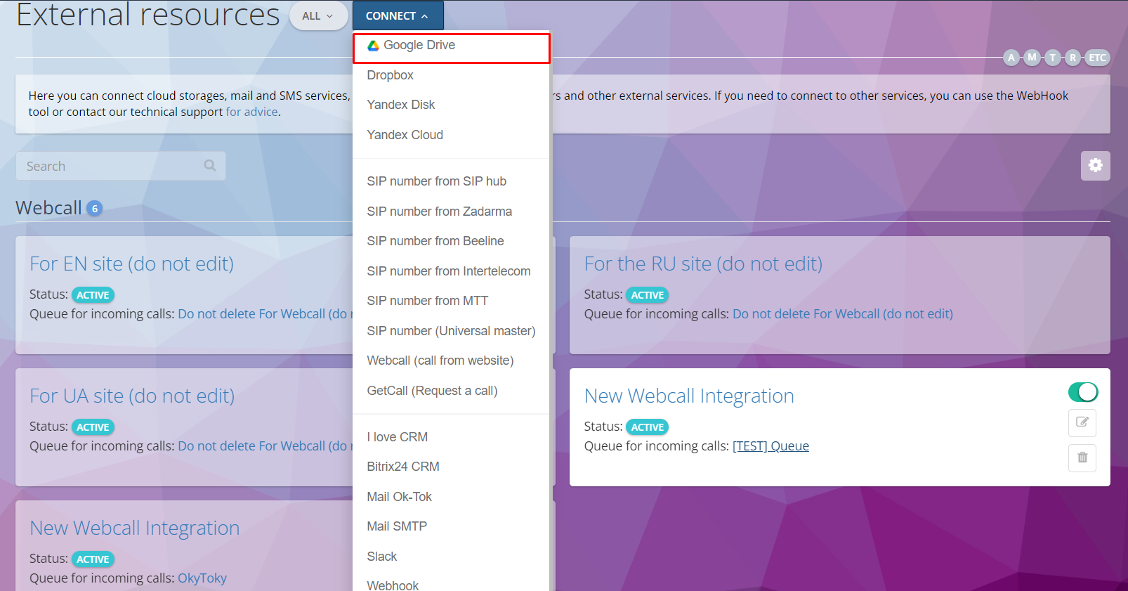 As an external storage for call recordings in Oki-Toki. I have already described this in a previous article, where I compared Google’s external storage and our internal one. It’s enabled in the “External Integrations” section. Connection is as simple as filling out a form and authorizing Oki-Toki in your Google Drive.