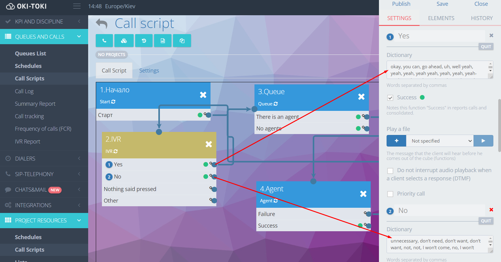 We offer free use of an improved IVR with voice recognition. It has the functionality of recognizing not only words but also phrases. By specifying several synonymous words, you give the client the opportunity to deviate from standard answers and respond instead of “yes”, for example, “of course”, “agree”, “uh-huh”, “want to try”.