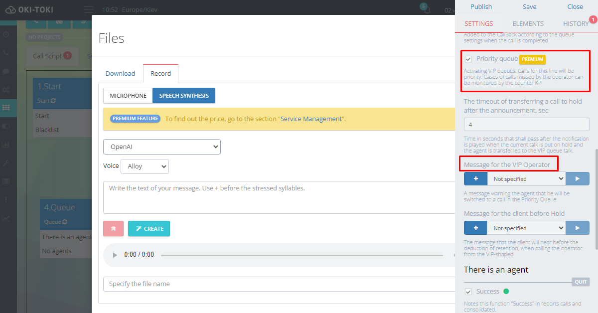 - Using the “Add Audio” button, create voice messages using a robot for the agent and the client not in the Priority Queue. You can also upload a ready-made file;