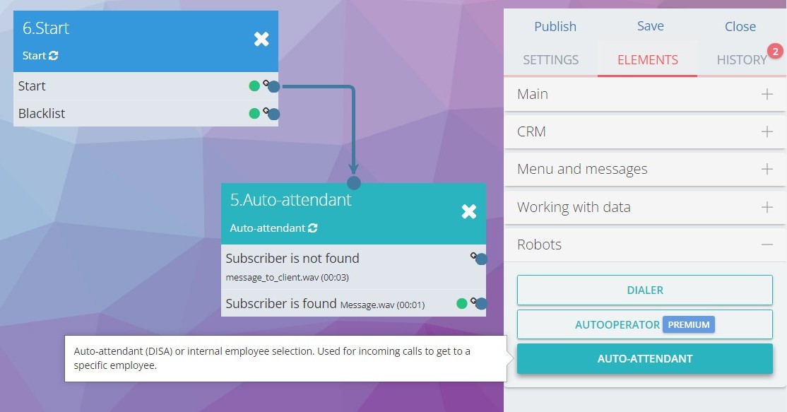 Auto Secretary – a robot that can connect to a specific company employee if the client provides his personal (internal) number. Ideal for call centers that provide a personal manager.